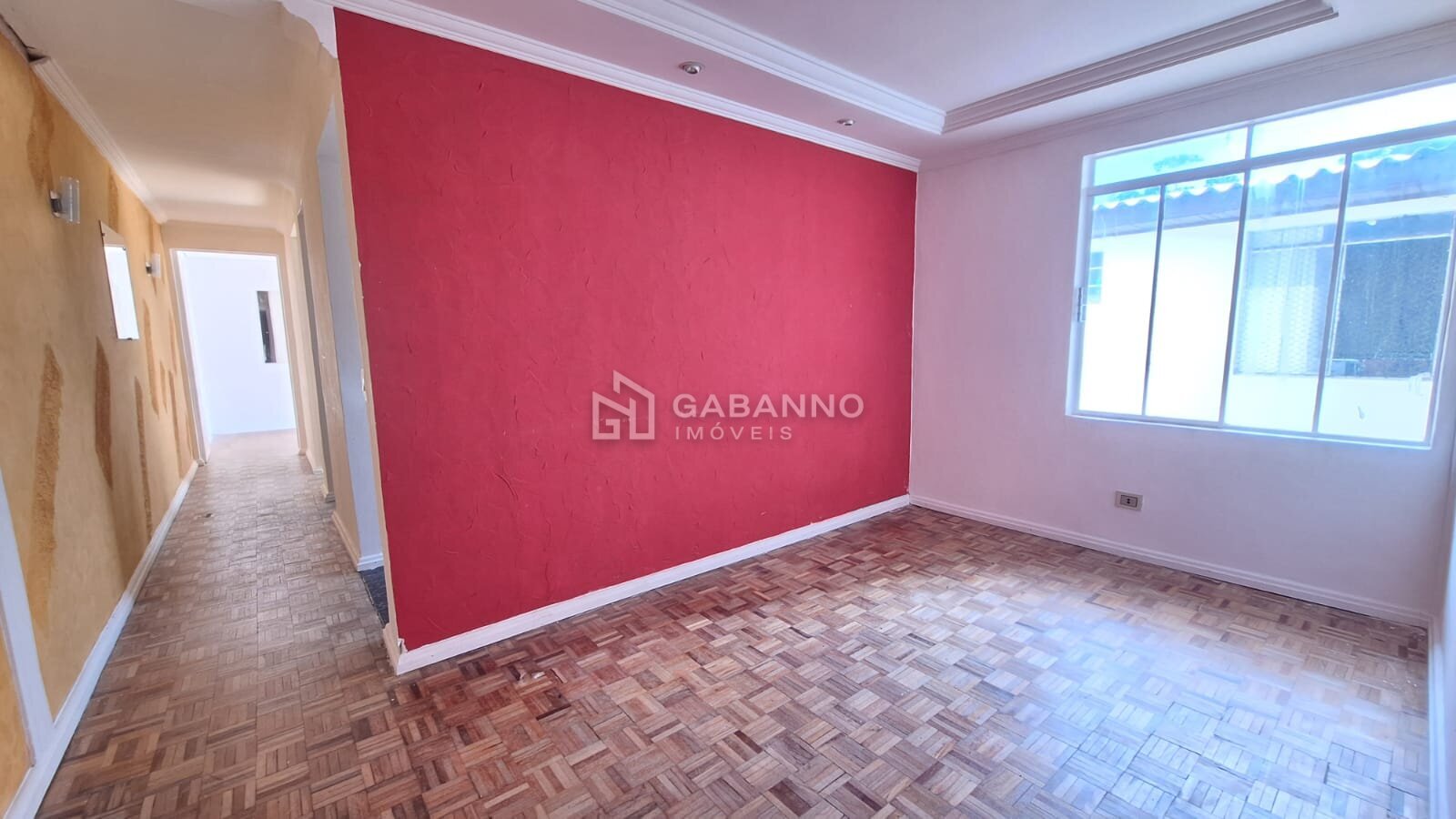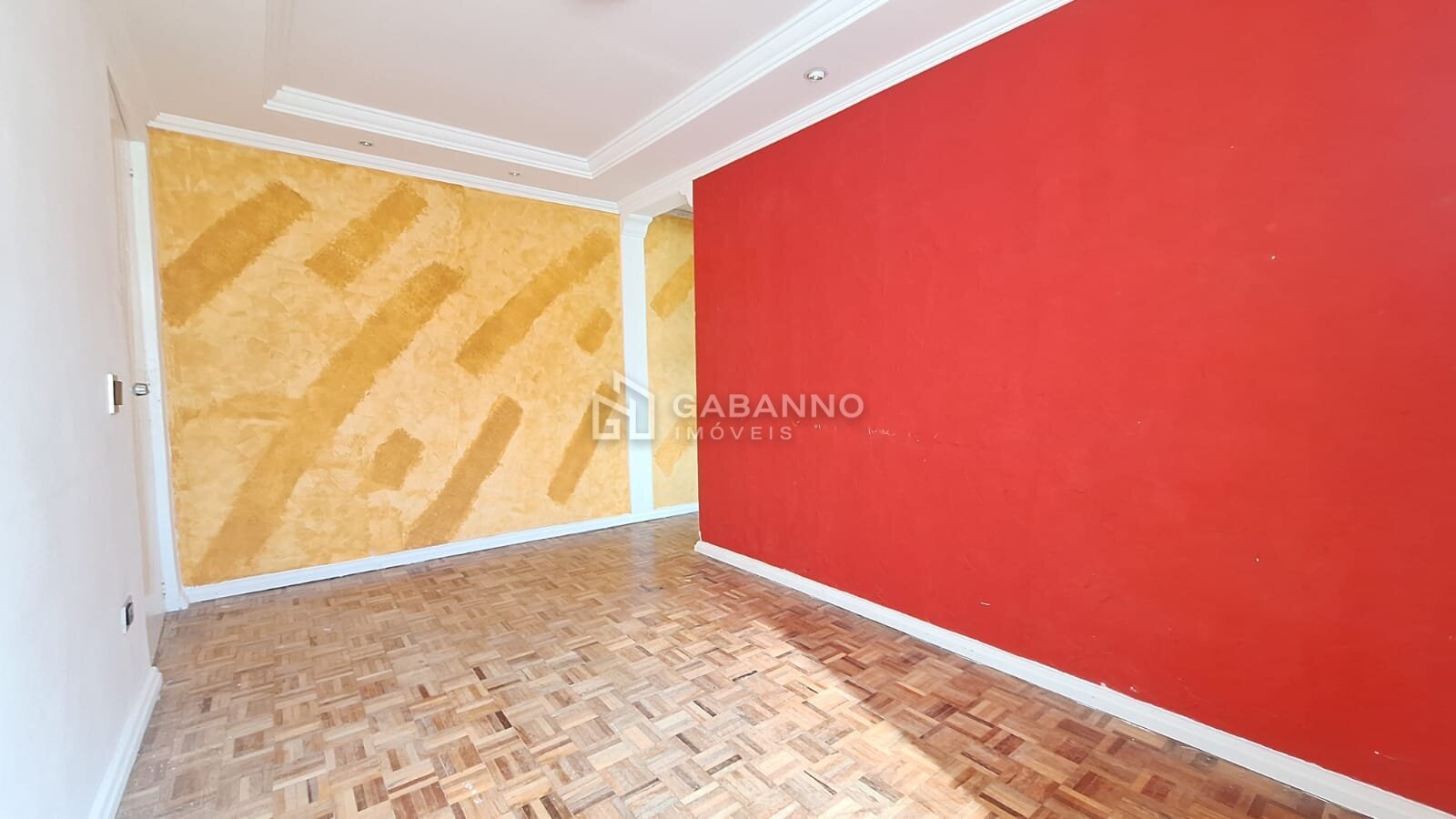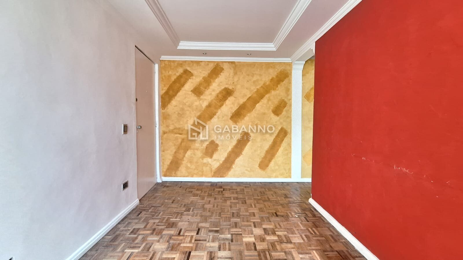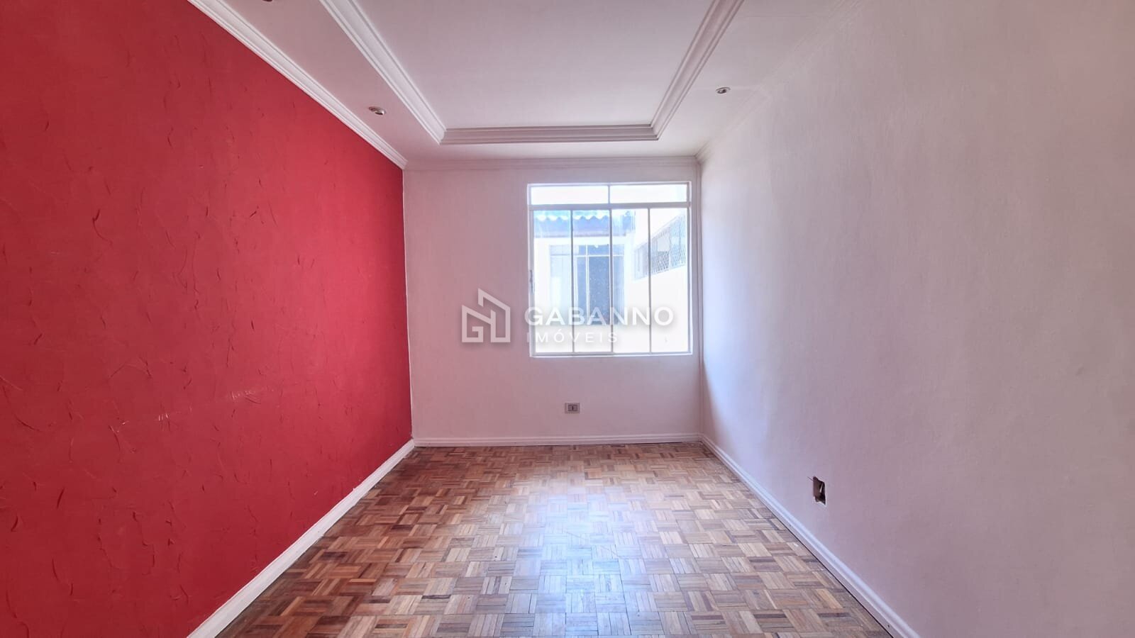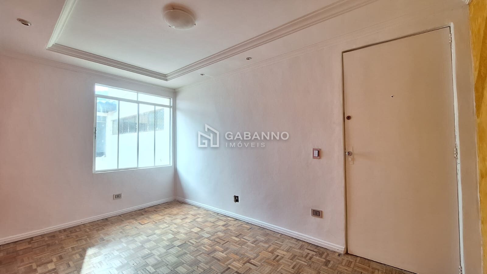 Sala com piso parquet de madeira, acabamento em gesso