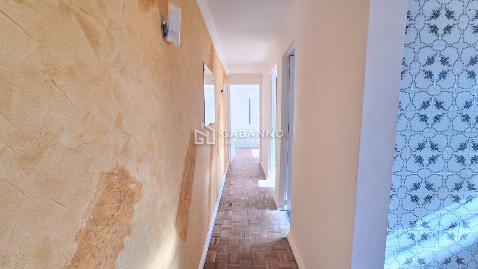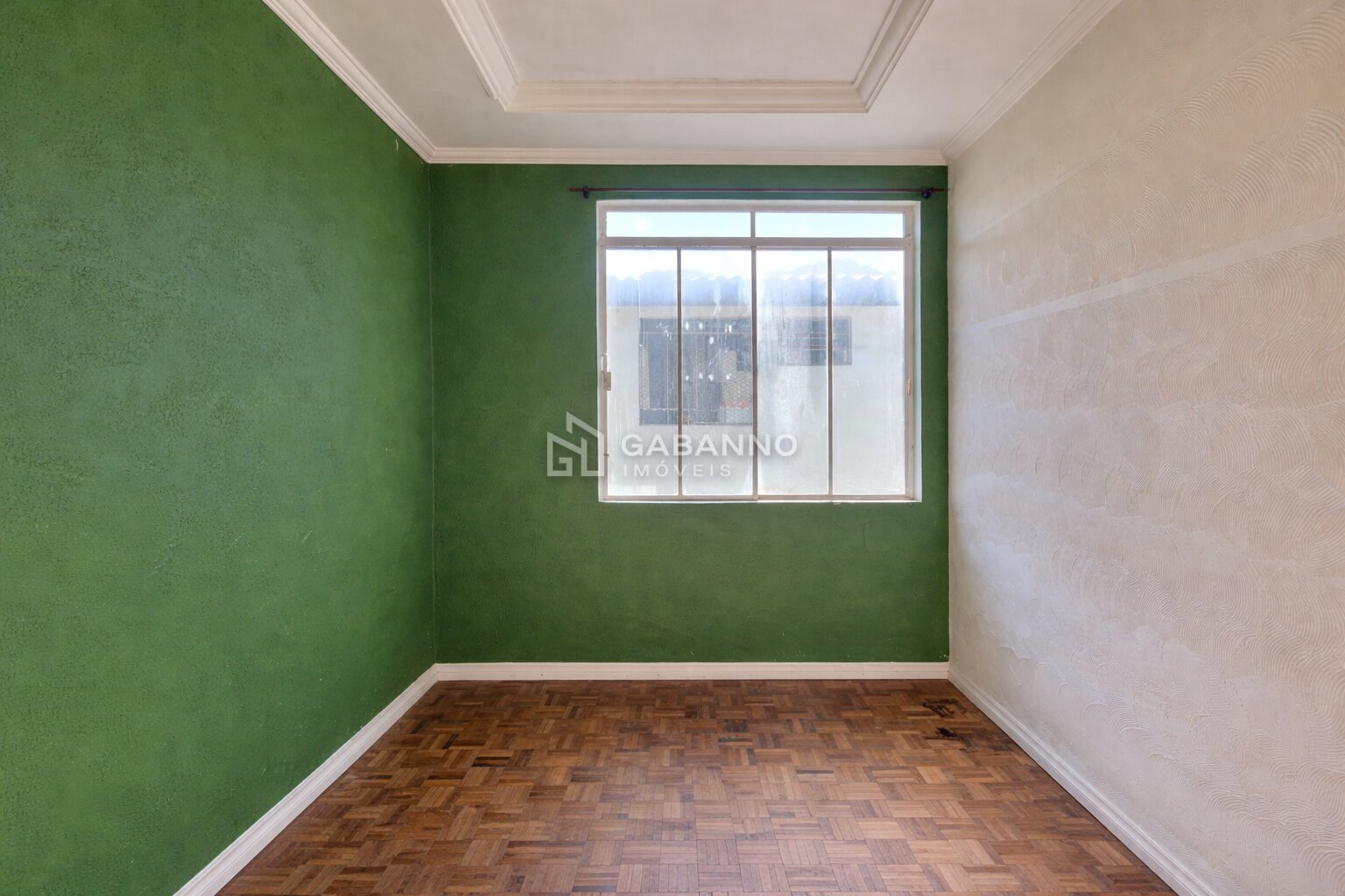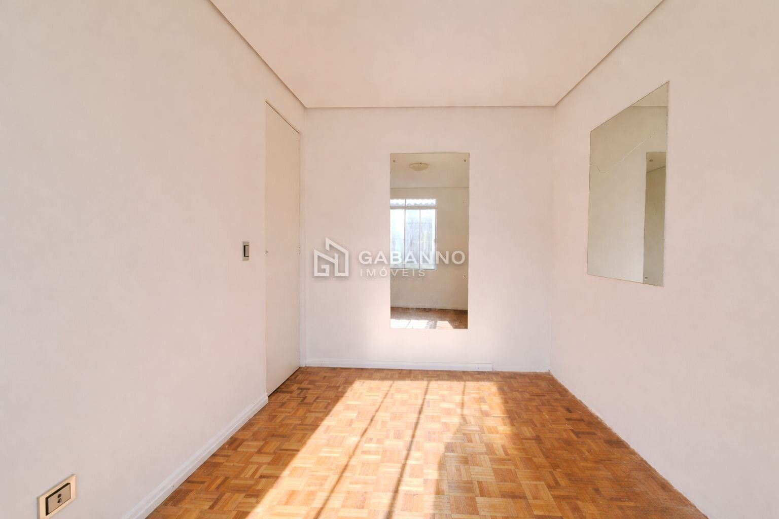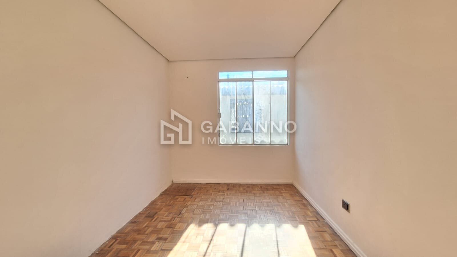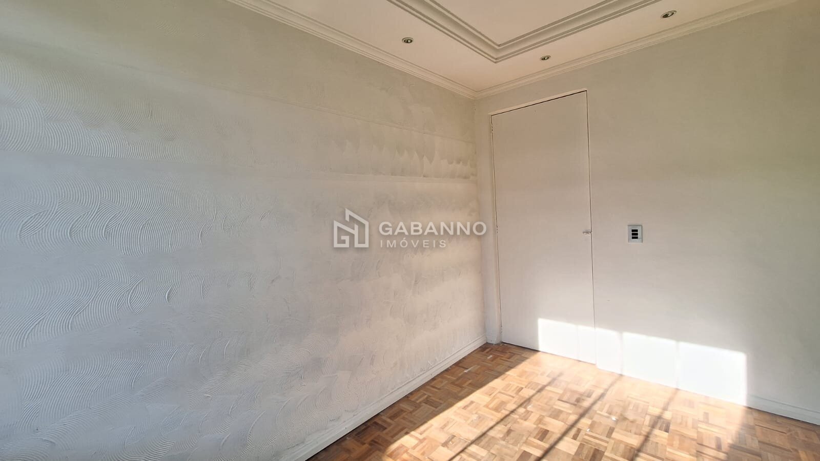 Sala com piso parquet de madeira, acabamento em gesso