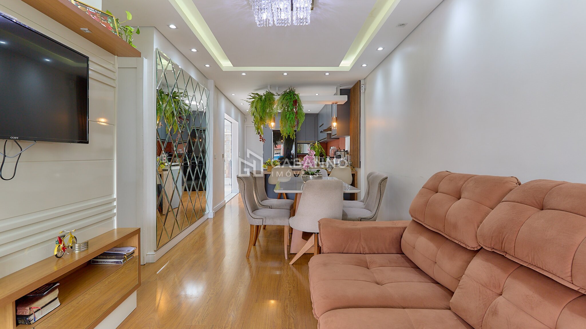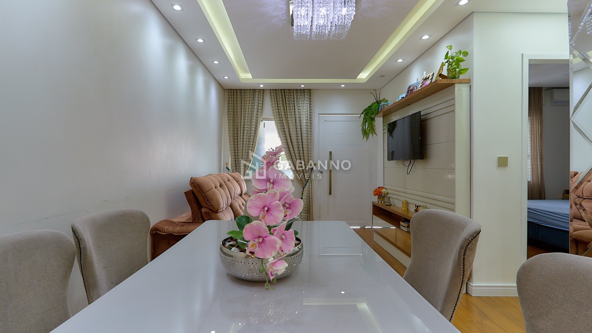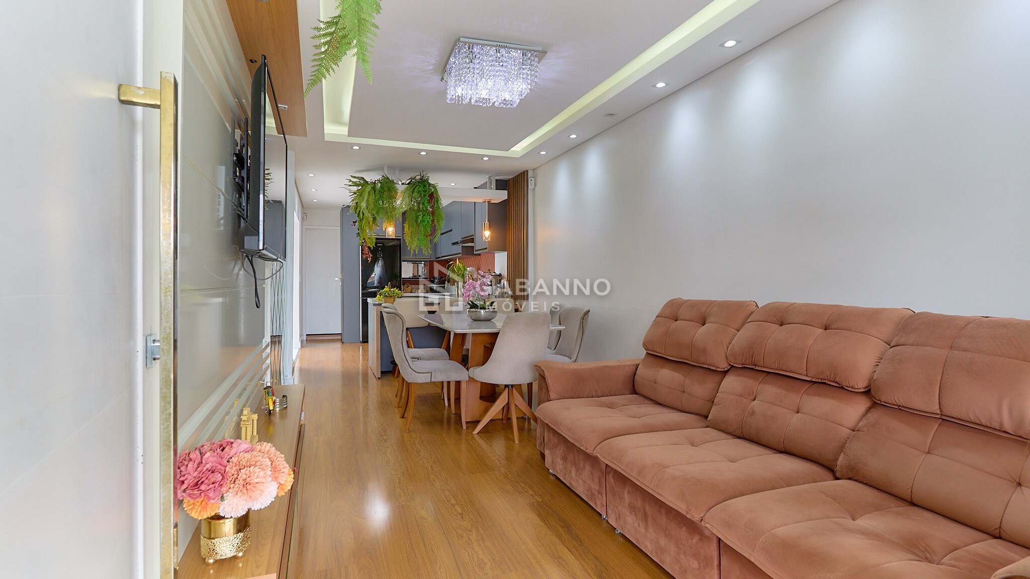 Sala para dois ambientes, com teto rebaixado em gesso, iluminação diferenciada e piso laminado;