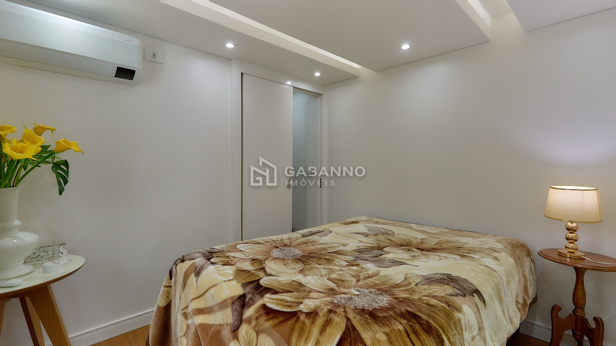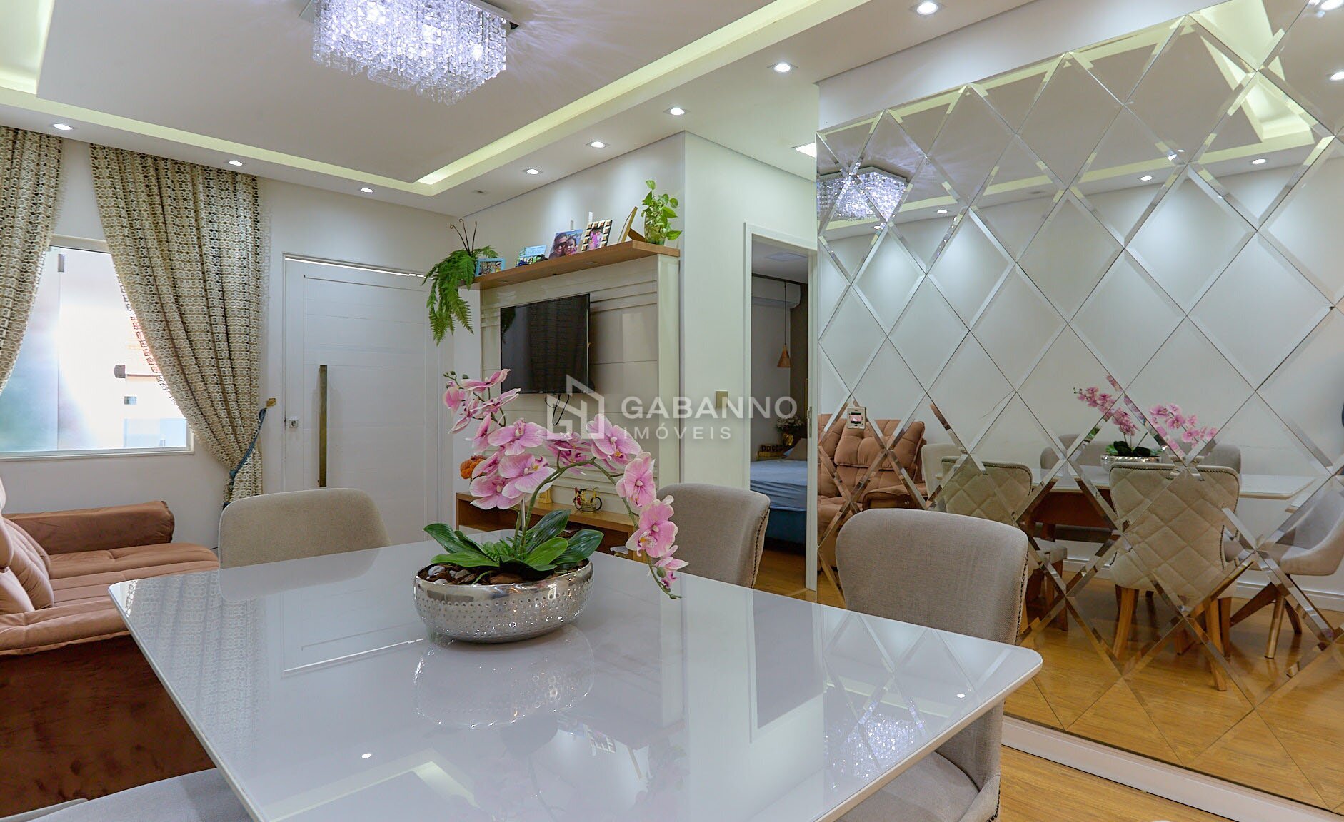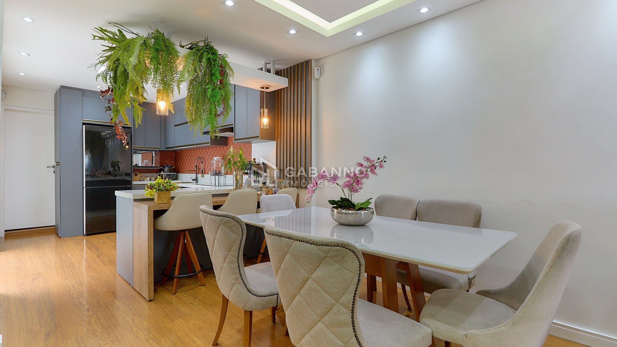 Sala para dois ambientes, com teto rebaixado em gesso, iluminação diferenciada e piso laminado;