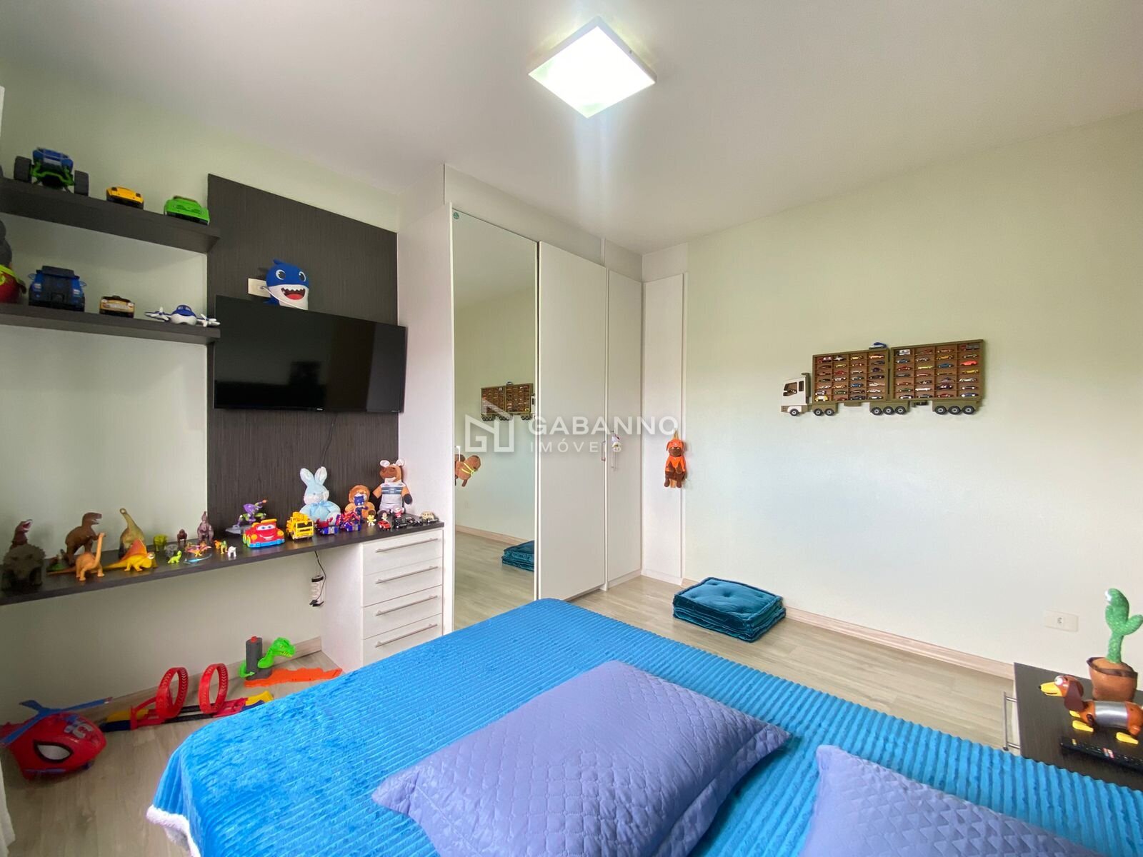 Duas suítes "junior", ambas com armários feitos sob medida, painel de tv e banheiros com box e armários;