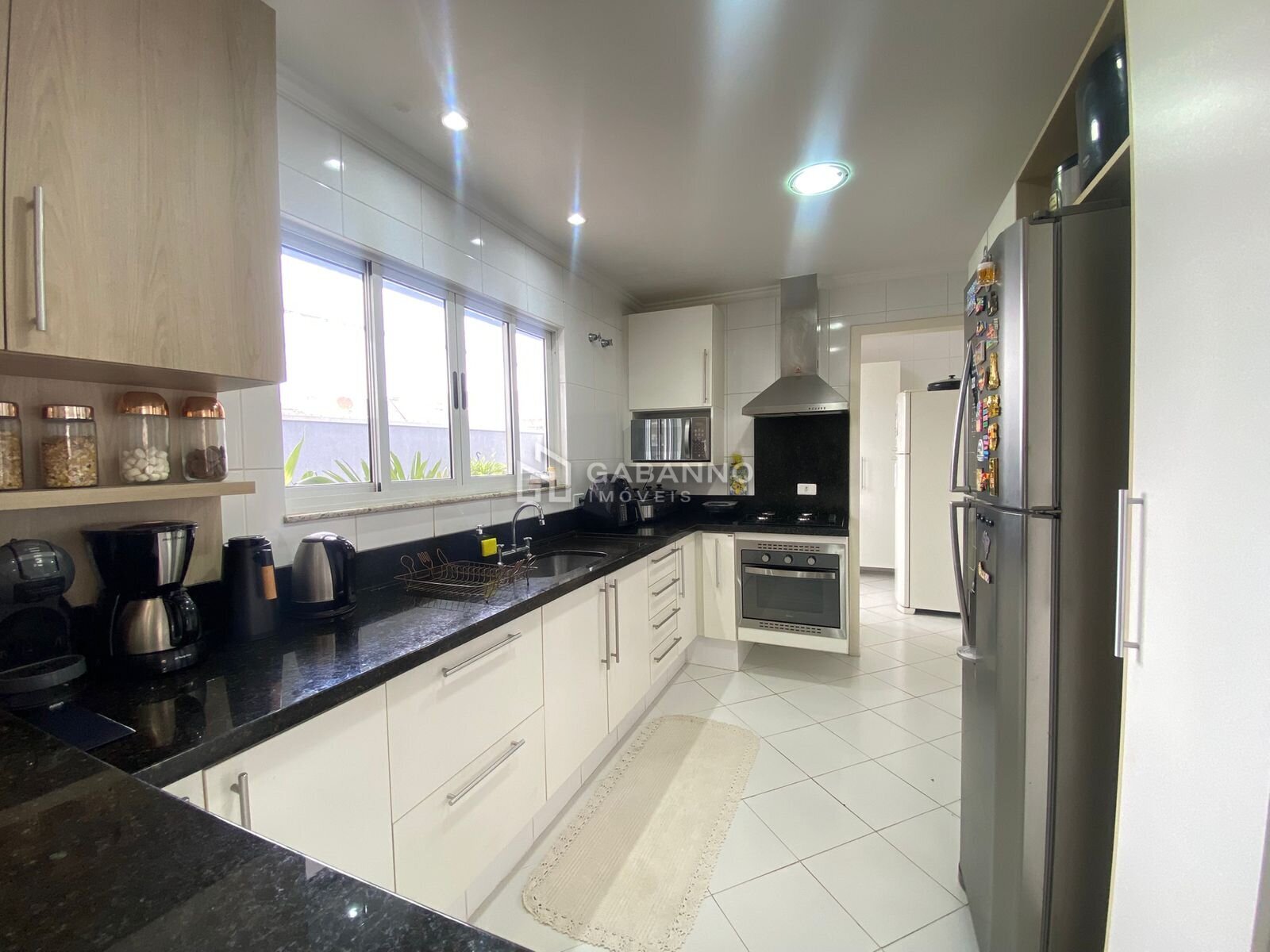Uma cozinha conceito aberto, com armários feitos sob medida, balcão em granito, lavanderia separada, com armários e entrada lateral exclusiva;